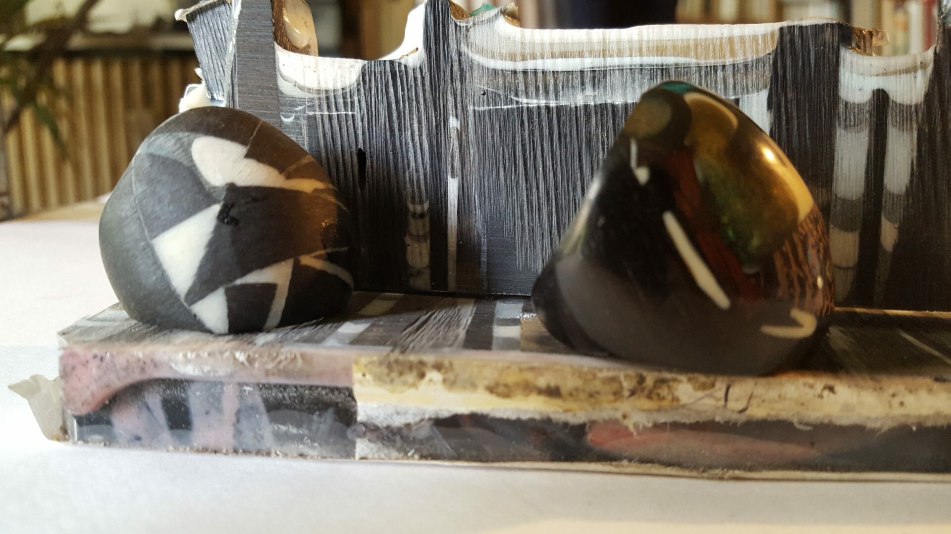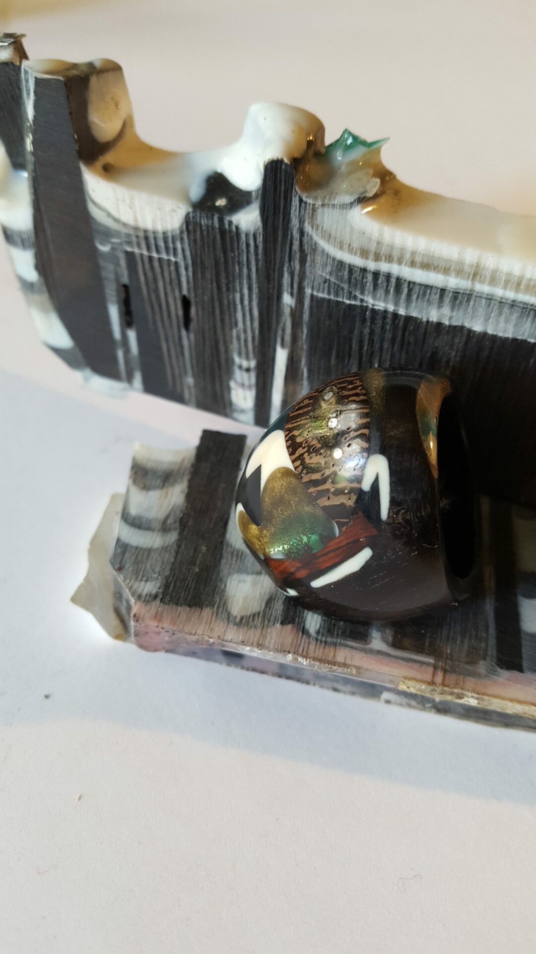 Les éléments sont scellés, encastrés avec une résine époxy transparente ou de couleur parfaitement polymérisée . L’usage d’un moule est parfois nécessaire pour réaliser l’ossature de la pièce.