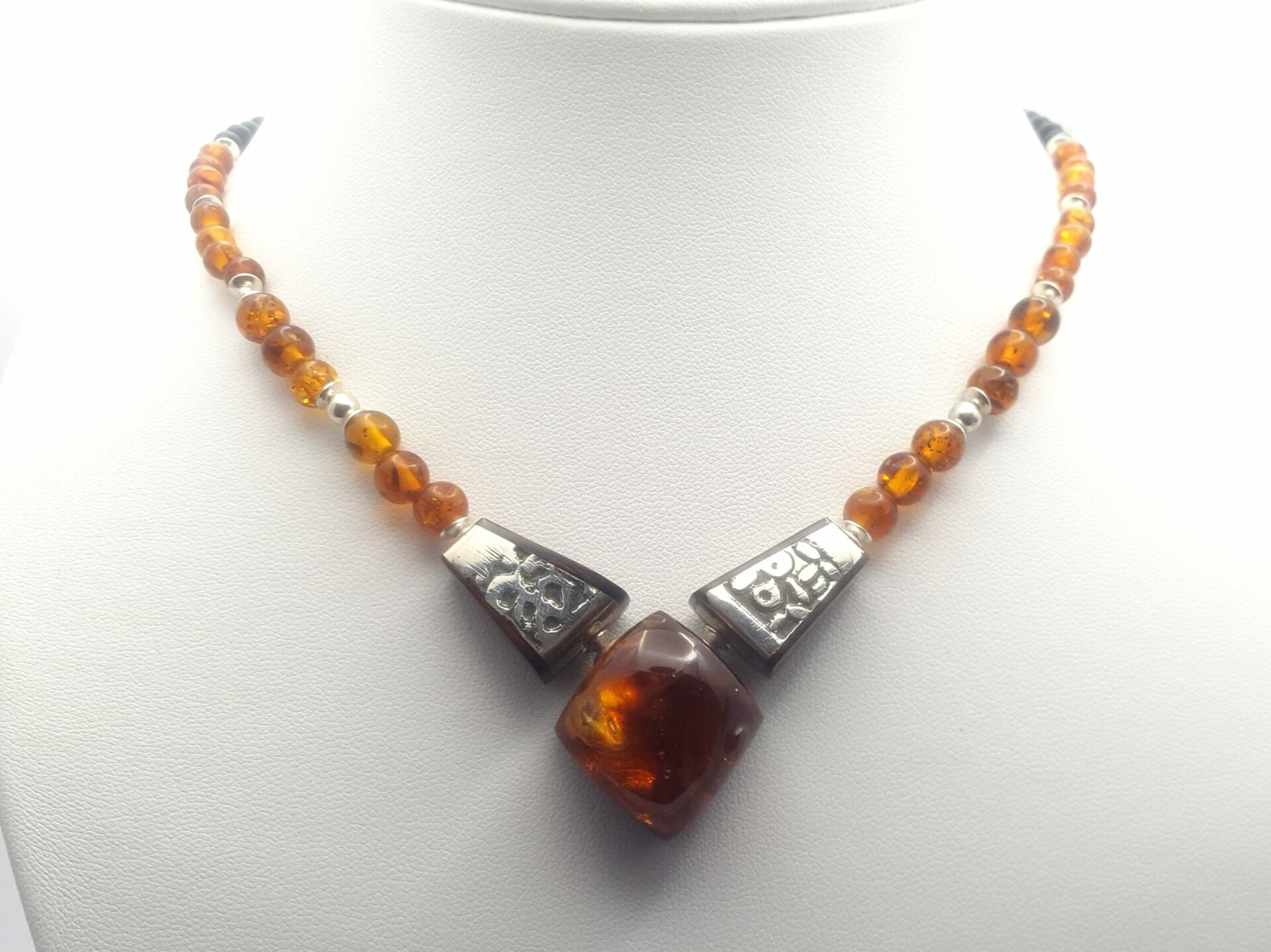 Collier ambre de la Baltique et plaques d’argent gravé et patiné .