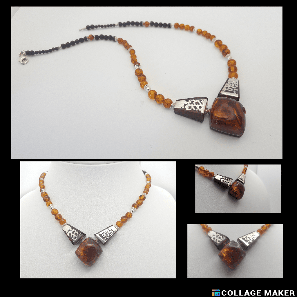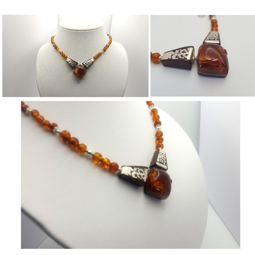 ambre amourette sont les matières de ce collier de trois éléments ; L’élément central losange est en ambre de la Baltique . Deux autres éléments latéraux sont en argent gravé  ( Eau-forte ) .  la technique est dite « une eaux forte » . Une eau forte  consiste à dessiner à la cire les reliefs sur les plaques de bronze  ou d’argent . Ils seront épargnés par l’acide lors du trempage . Les plaques d’argent sont galbées et encastrés dans de l’amourette ( bois précieux )  . La chaine est composée de perles en onyx dépoli et d’ambre de la Baltique  ( Perles rondes  sont de 6 mm de diamètre ) ;le fermoir mousqueton est en argent . ambre amourette s’harmonisent parfaitement .