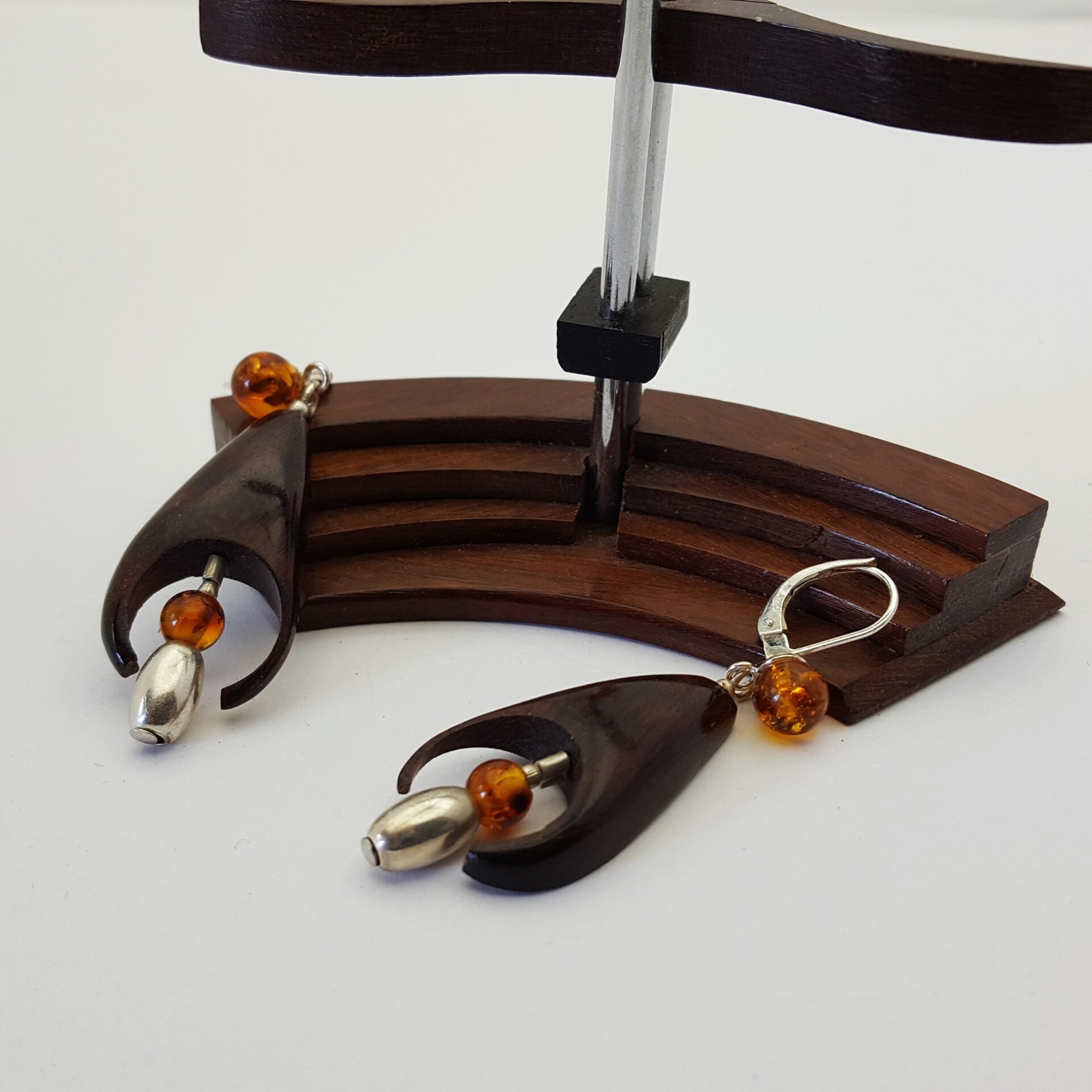 Boucle Magma bois précieux sont en bois d’amourette une essence de Guyane . Cette forme ajourée est galbée . Dans le cercle vient se loger une flèche d’ambre et d’argent . Boucle Magma bois précieux parfaitement polies s’accroche aux « dormeuse » . Dans les soucoupes des « dormeuses » sont fixées des perles d’ambre de 6 mm .