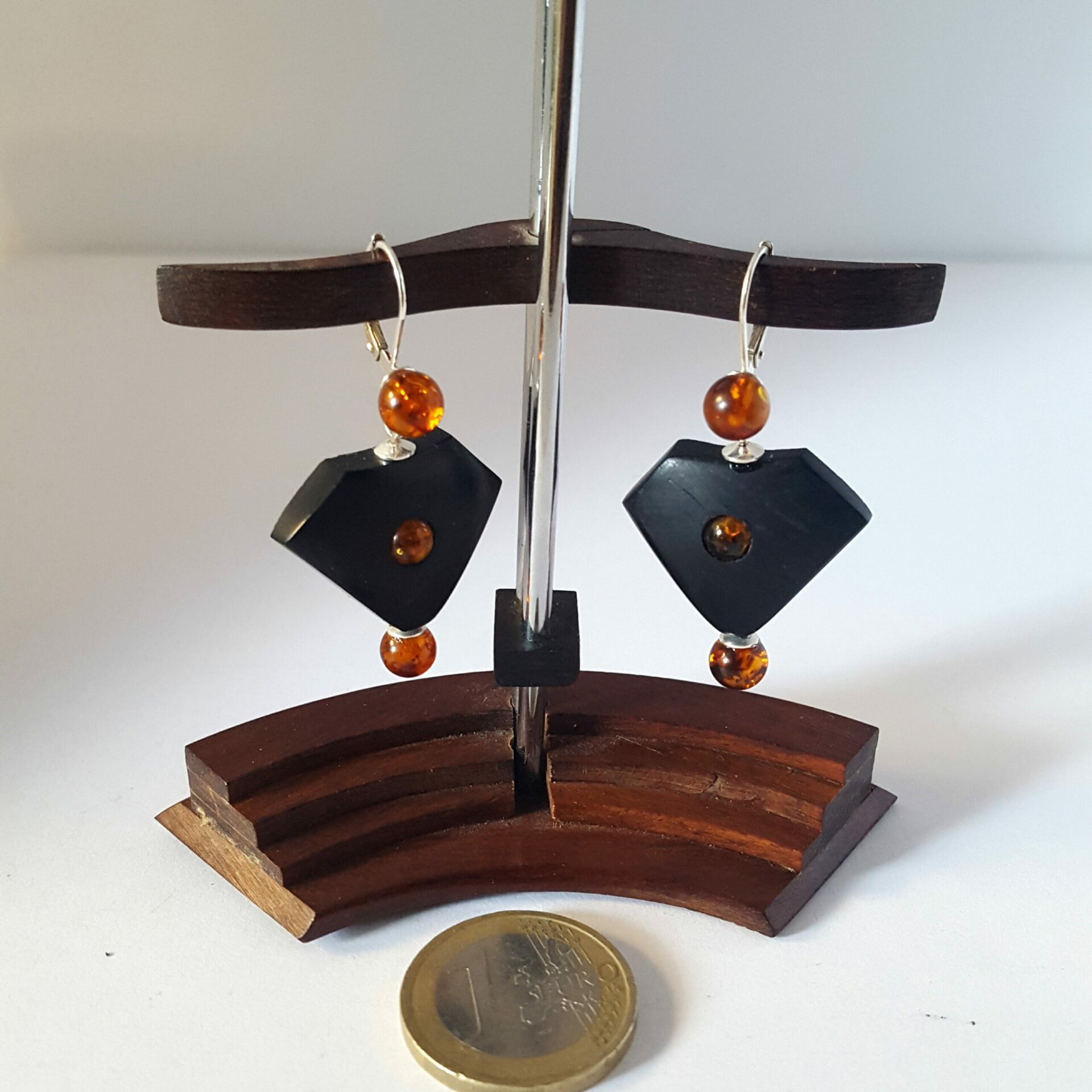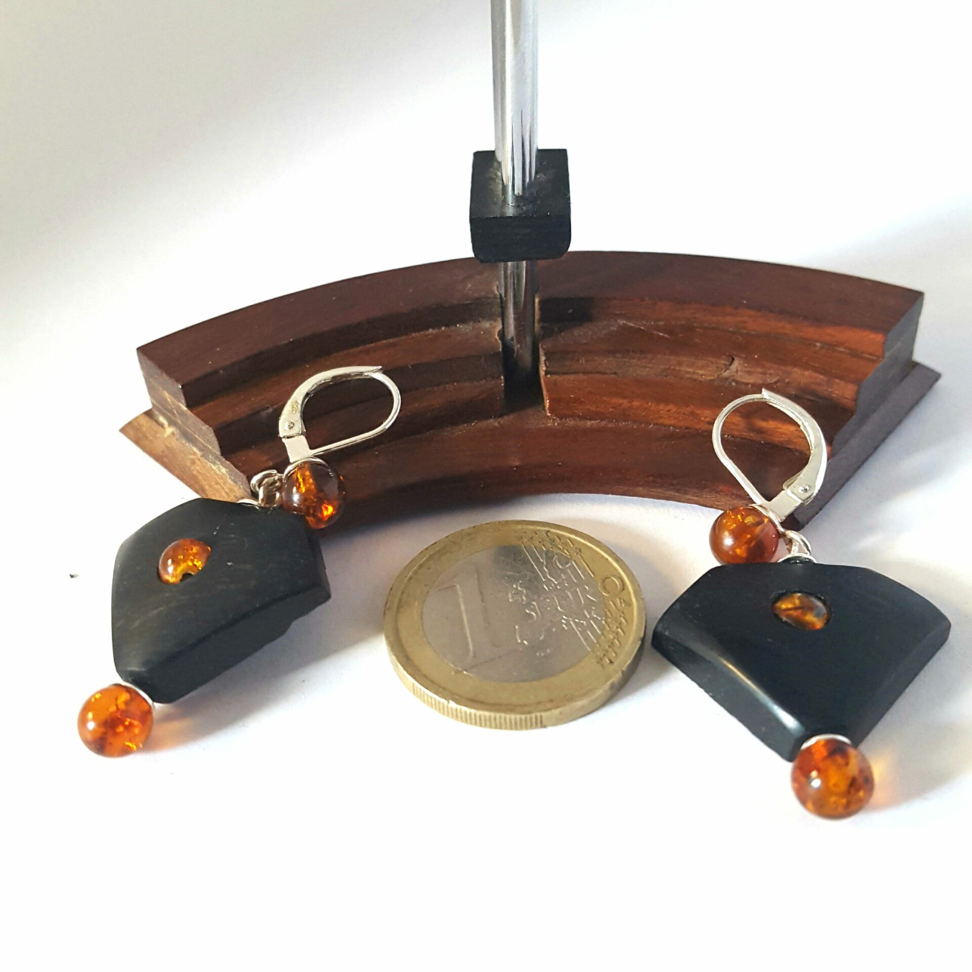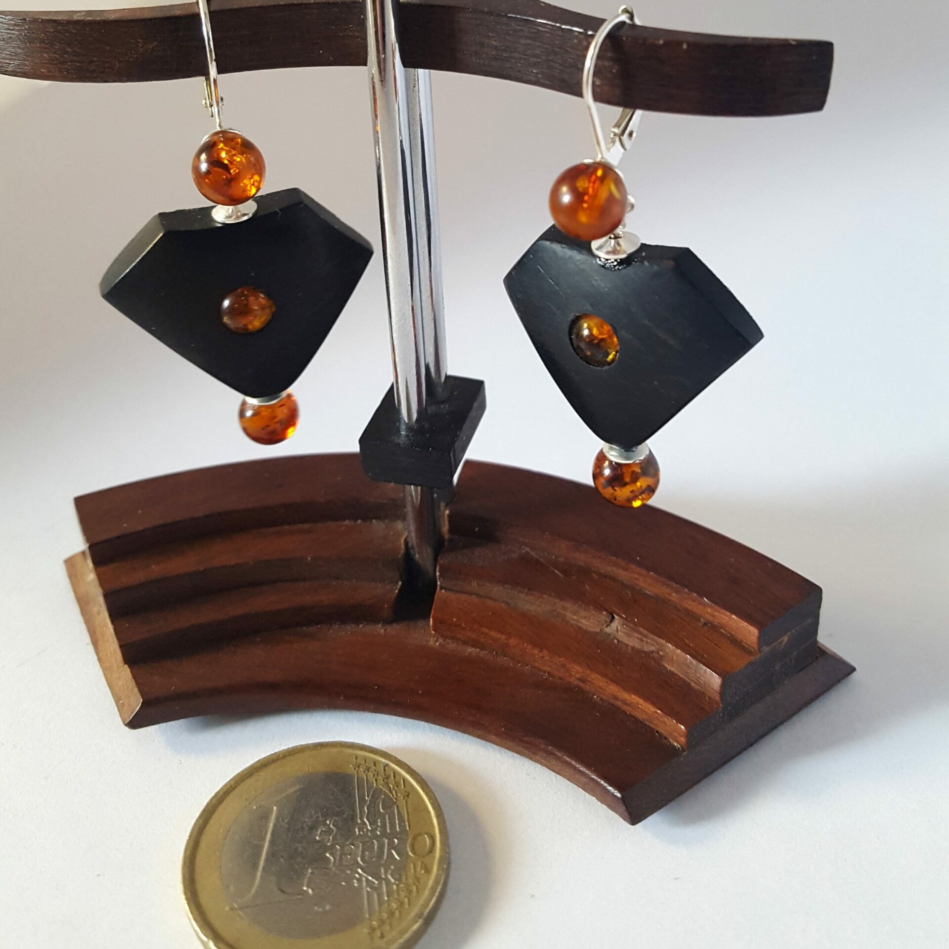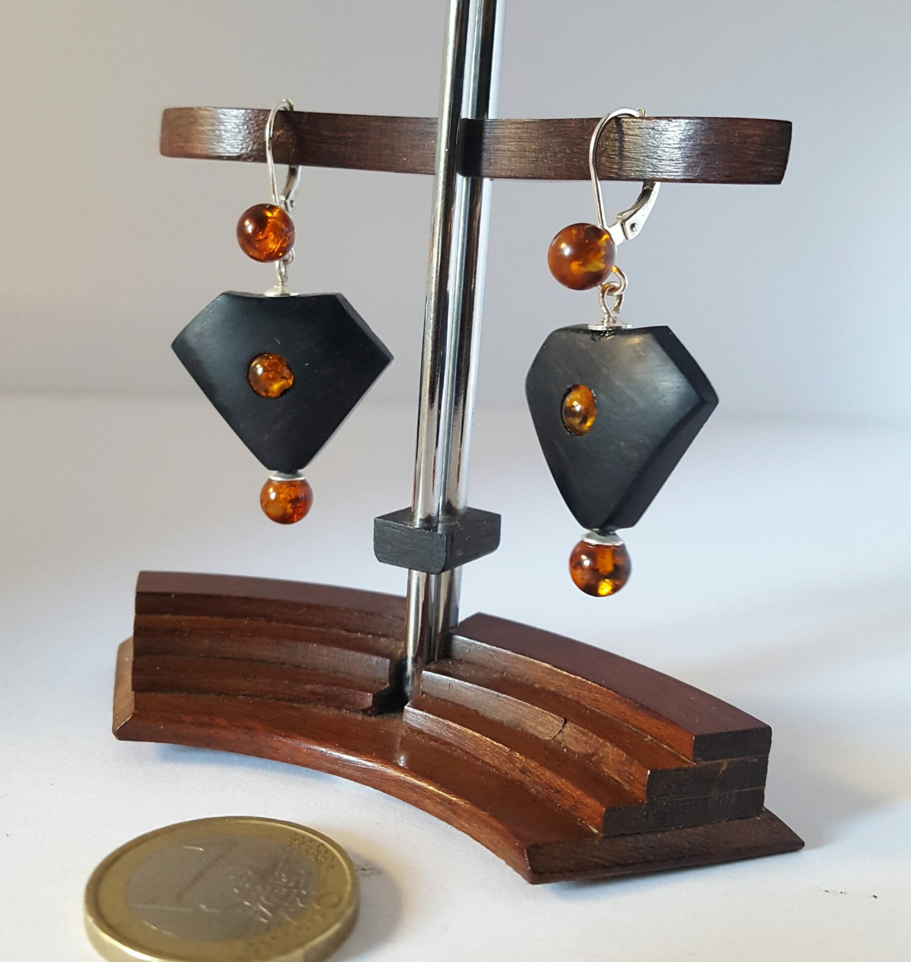 Boucles d’oreilles Magma . La structure en ébène du Gabon est ajourée et bombée .Elles sont agrémentées de perles en ambre de la Baltique de 6 mm , Les appréts et attaches sécurisées sont en argent .