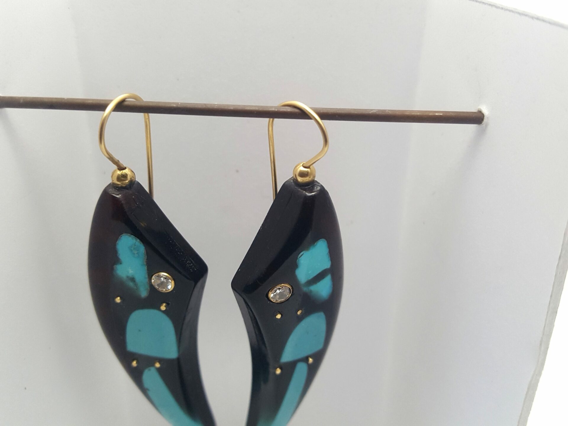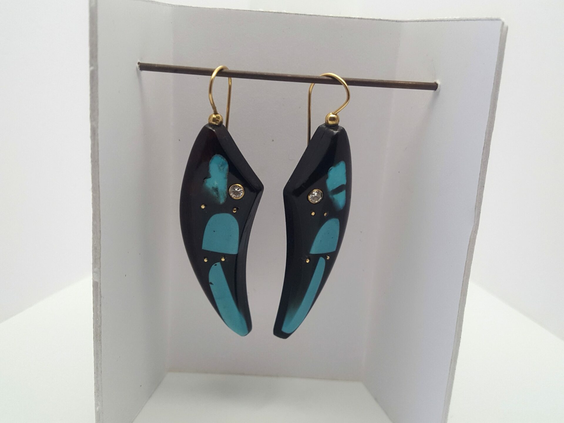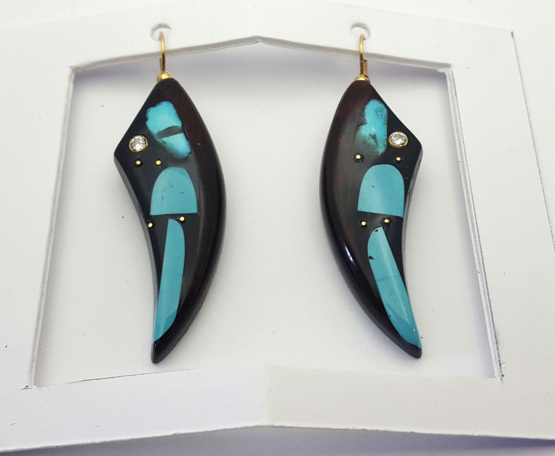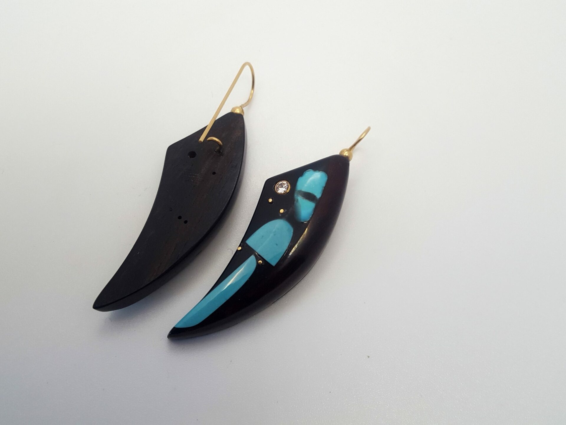 Boucles d’oreilles . La turquoise , l’or et ébène sont les élément principaux de cette boucle d’oreille. L’Epoxy noire se loge dans un arc de bois précieux ( l’Ebène du Gabon formant la courbe extérieur ) . Le dos des boucles sont également en Ebène. La Turquoise véritable est encastrée dans un lit d’époxy noir , les piqures sont de petits clous d’or . L œil en oxyde serti d’or est encastré aussi dans le lit noire d’époxy . Les accroches de fil ( 7/10 ) sont en or 18 carats ainsi que les perles et les finitions . Le dos de la boucle d’oreilles est également en ébène . Les éléments qui contituent ce mono bloc forme un bloc parfaitement omogène . ce bloc est ensuite poli dit « mirroir » . C’est pourquoi ne surgit qu’en relief le serti d’or et son oxyde . La turquoise , l’or et l’ébène dans ce lit d’époxy noire sont en effet d’une harmonie singulière . La forme de ces boucles d’oreilles n’est pa s sans évoquer les long boucliers des Dogon , ethnie d’Afrique de l’ouest .