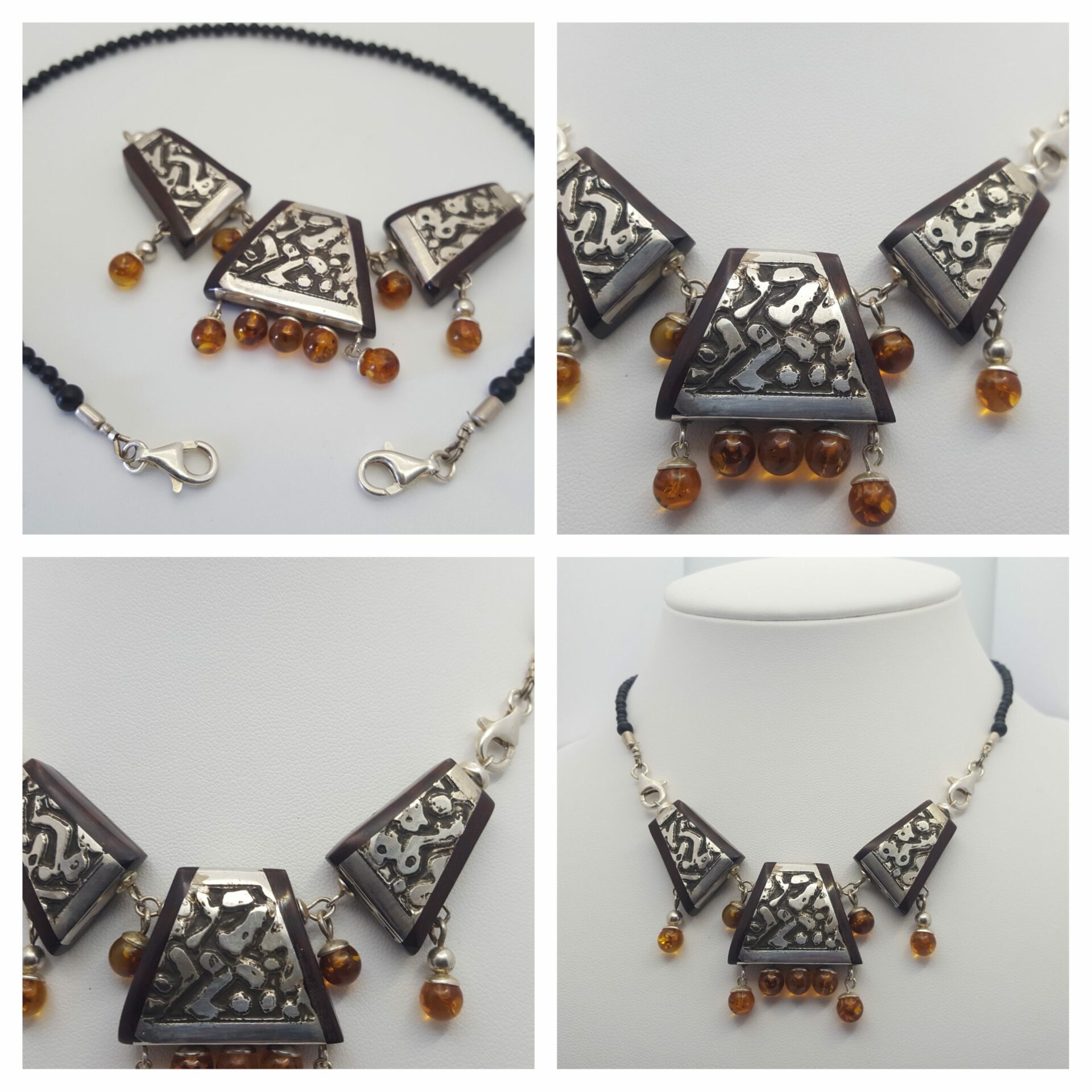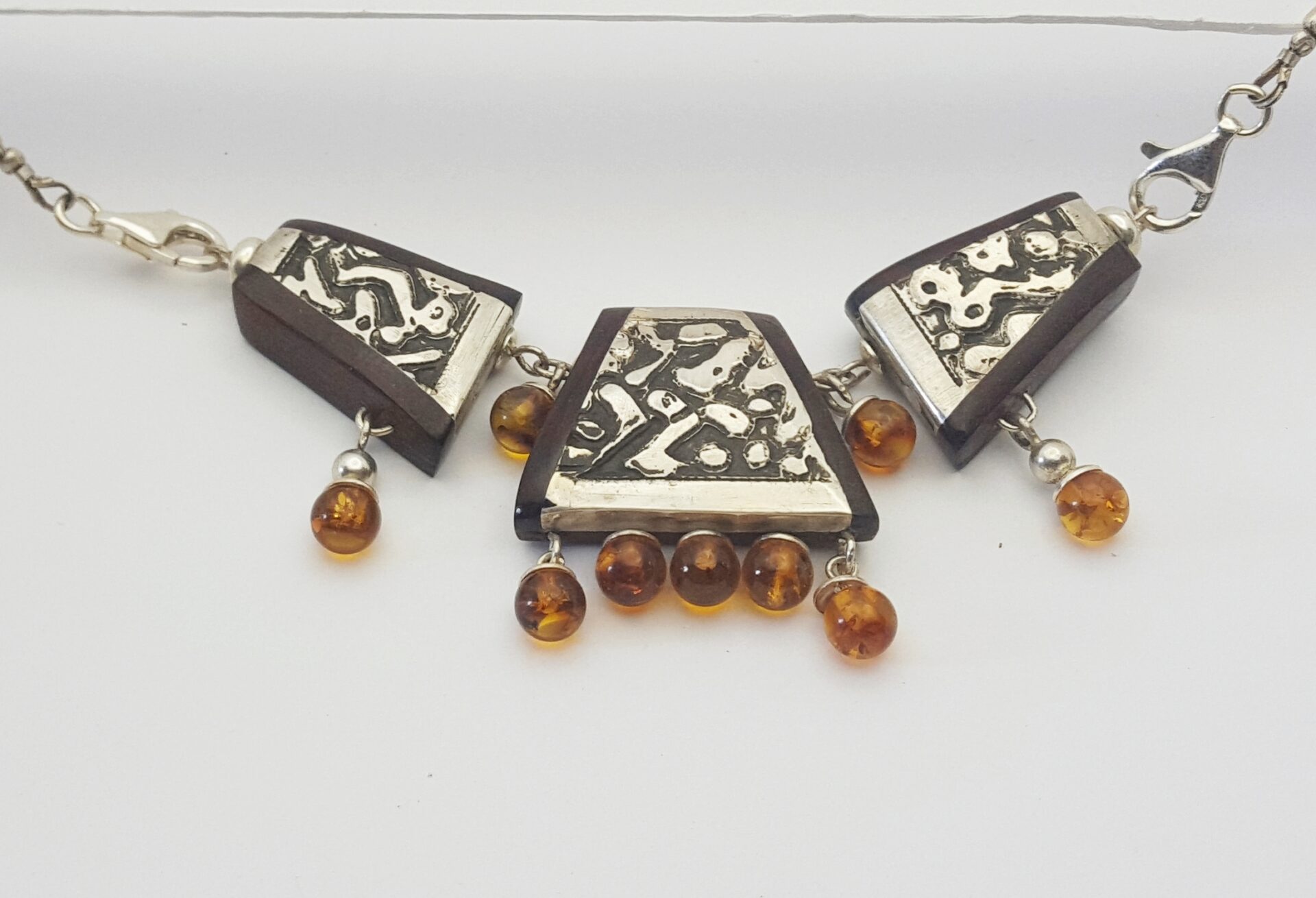 collier argent ambre est un collier trois éléments d’argent . Il est gravés et patinés (eau forte sur argent ) .perles sont en ambre de la Baltique .