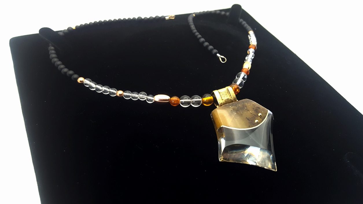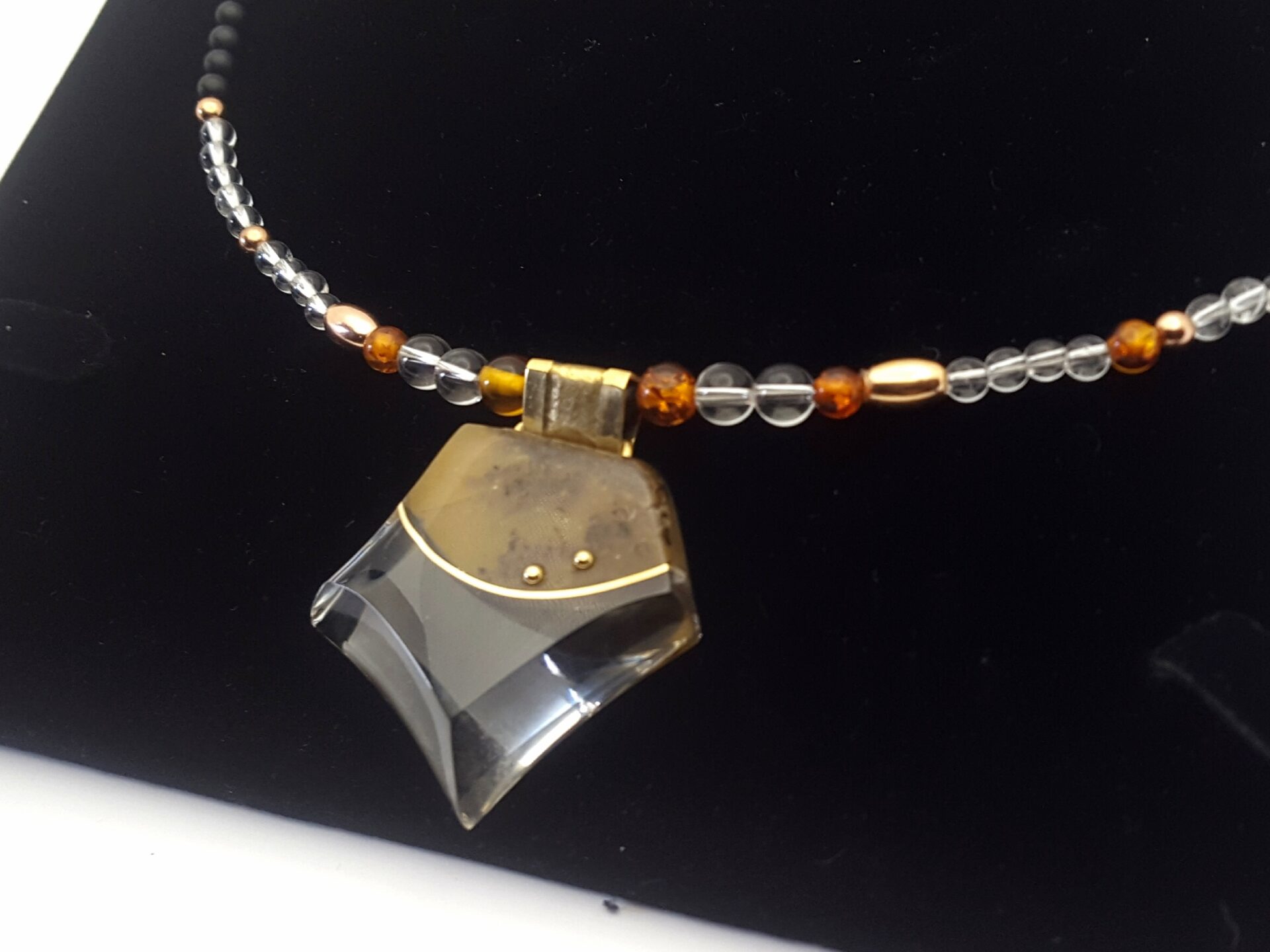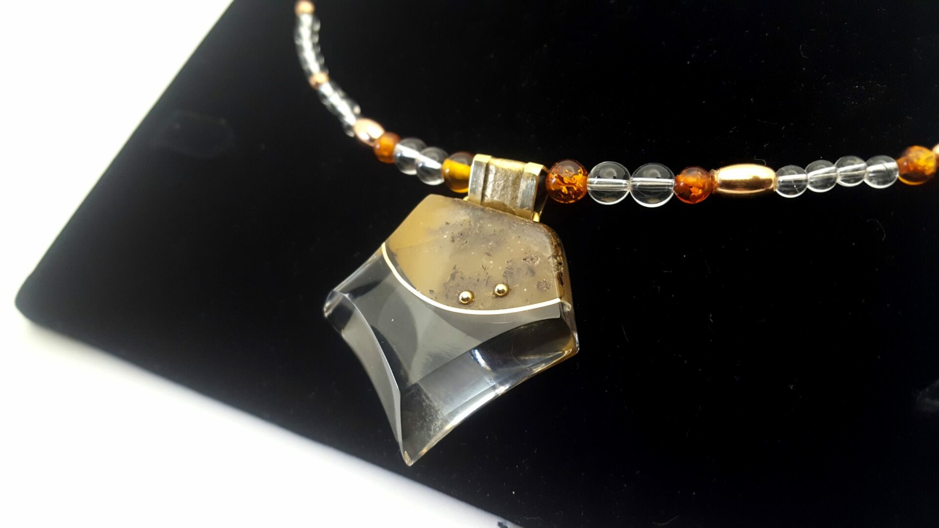 Sur ce collier médaillon ambre cristal trois petites perles de vermeil ( argent doré ) sont encastrées dans l’ambre . Il est Rattaché par une bélière en bronze gravé ( eau forte ) à une chaine de perles en ambre , en vermeil et en cristal de roche ‘