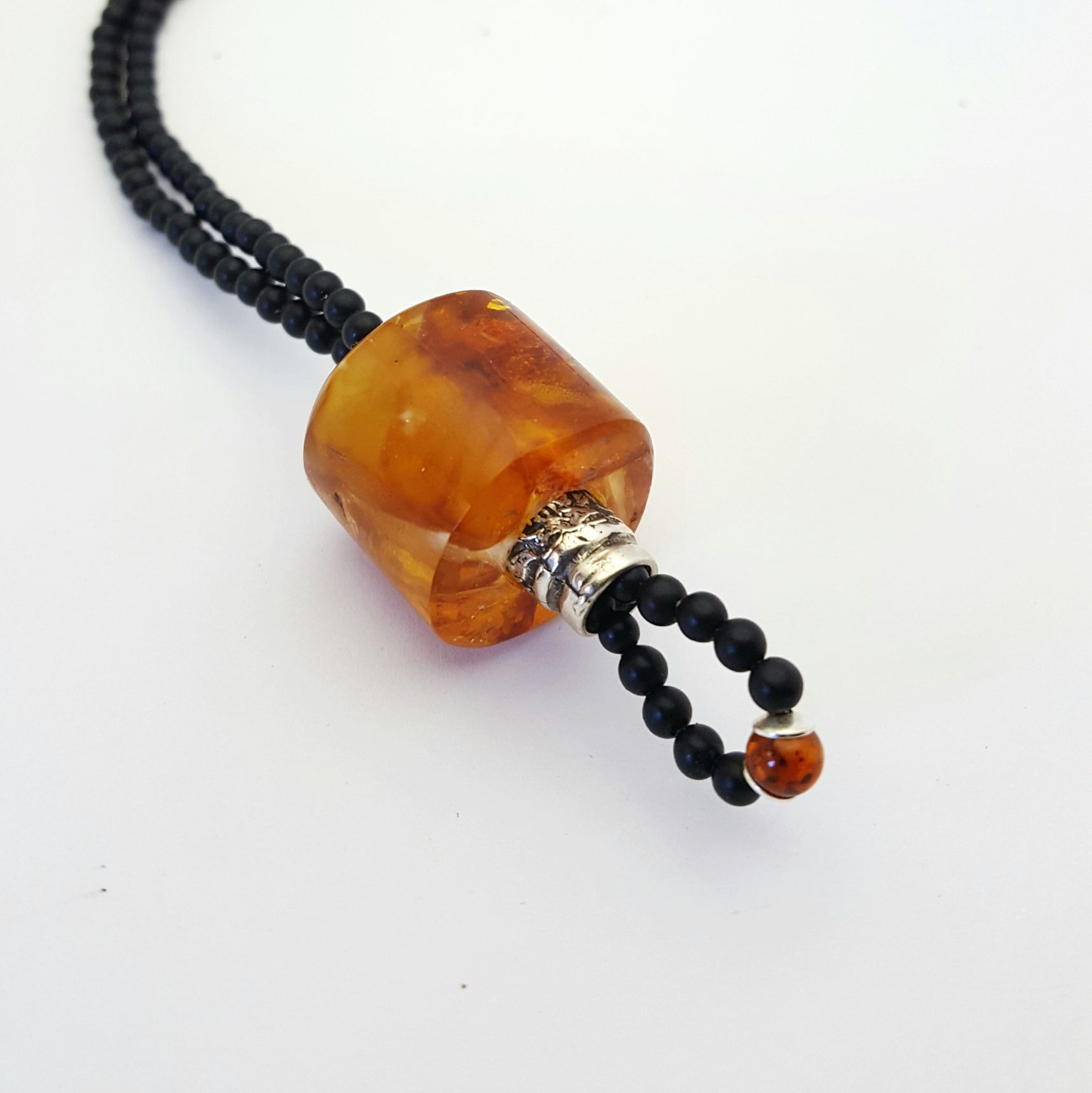 Sautoir ambre est bloc de mosaique d’ambre . Cette mosaique est composée de bloc d’ambre de différentes tonalités . sa forme cylindrique n’est pas en évoquer un petit tambour . Sautoir ambre est glissé justement dans un sautoir de perles en onyx . La taille des perles est de 6 mm . Son allure « décontractée » ne l’empèchera néanmoins pas de s’harmoniser avec la plus chic des tenues .